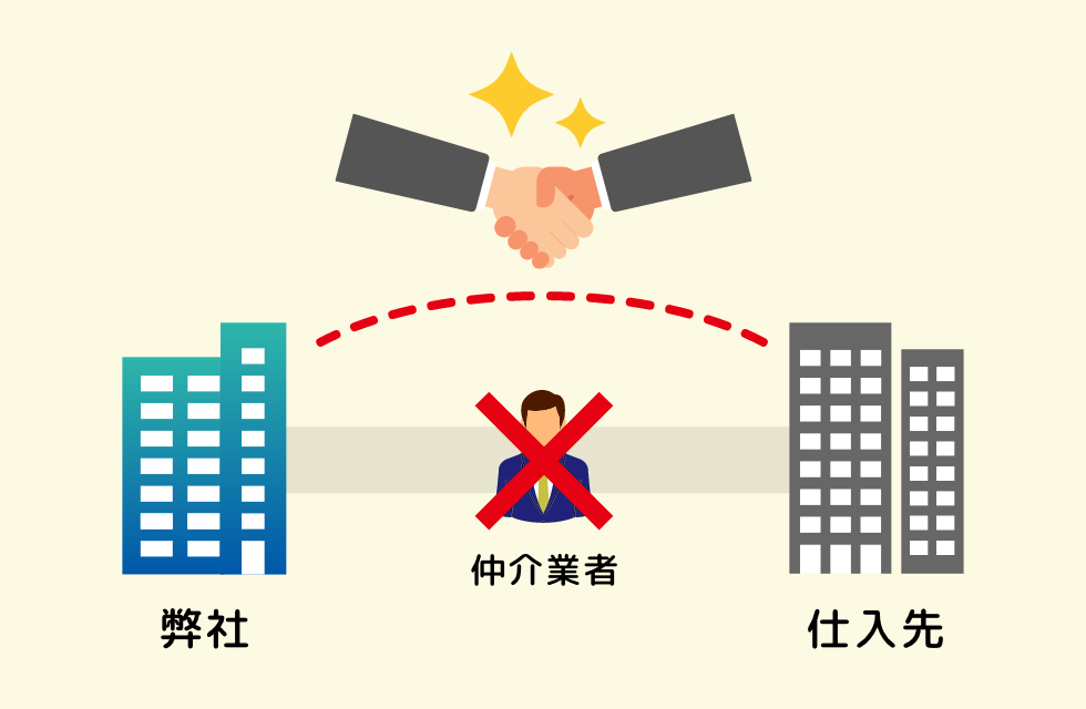 当社は、独自のルートで商品を仕入れており、お客様にお得な価格で商品をご提供することが可能となっております。 通常の仕入れ方法とは異なり、仲介業者を通さずに直接取引を行うため、中間コストを削減できるのが大きなメリットです。